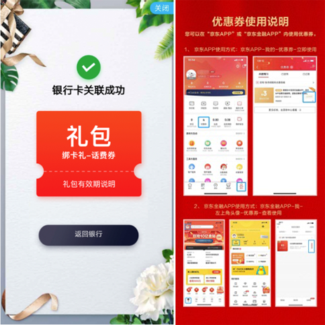 3.绑卡成功后,话费礼包会自动发放至绑卡对应的京东账号,您可在“京东商城APP-我的-优惠券”或“京东金融APP-我-卡包-优惠券”进行查看使用。