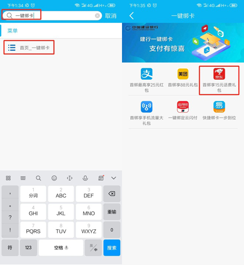 1.下载并登录最新版“中国建设银行”APP,在首页搜索栏中输入“一键绑卡”。进入“一键绑卡”页面,选择“京东”。