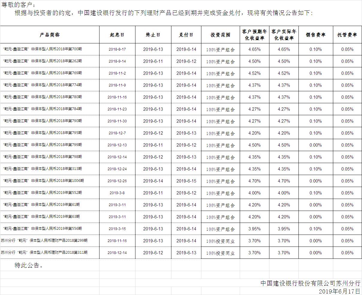 中国建设银行理财产品终止及清算公告