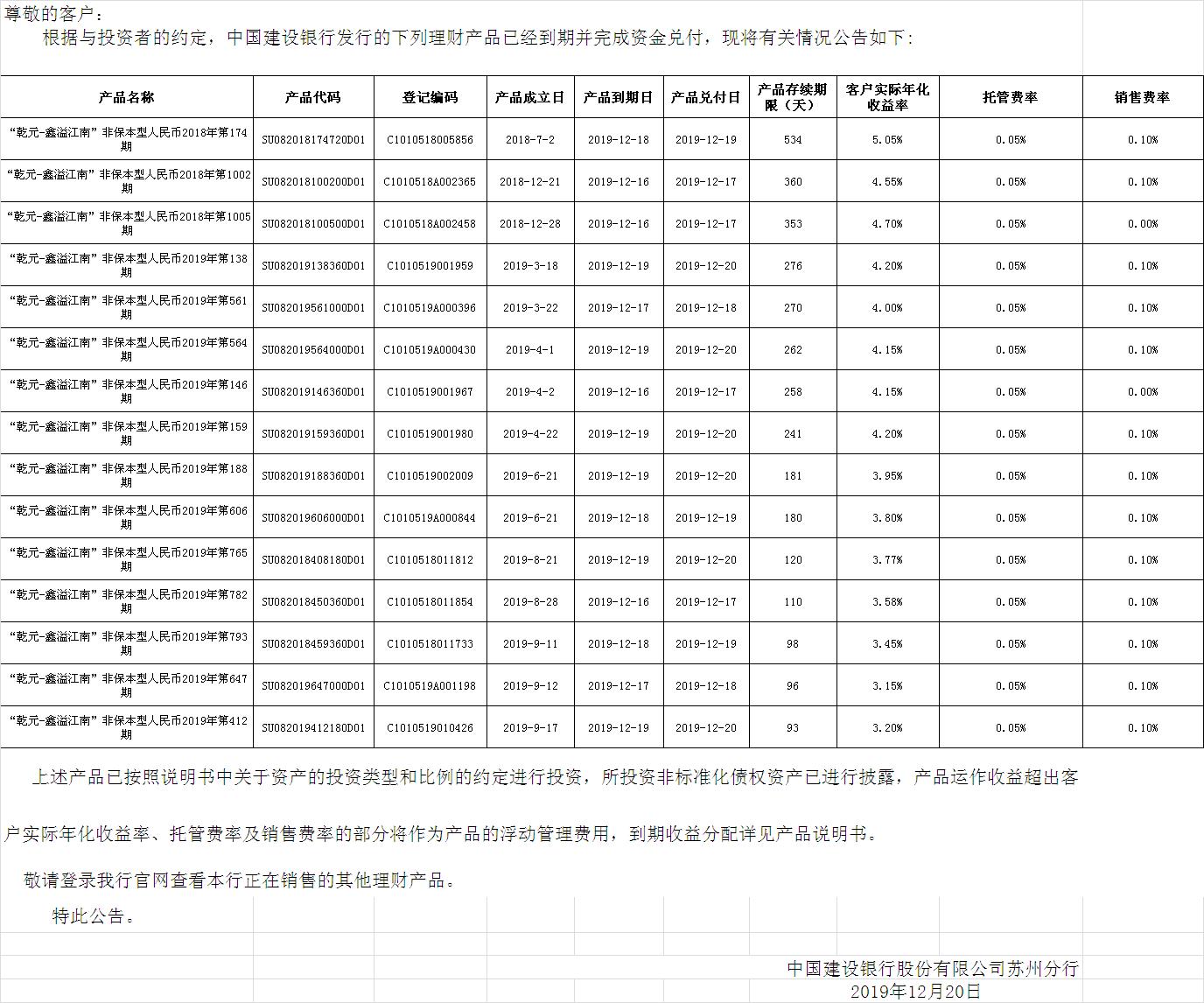 中国建设银行理财产品终止及清算公告