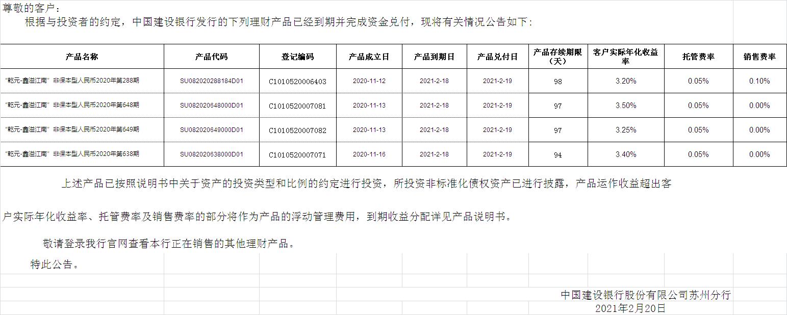 中国建设银行理财产品终止及清算公告